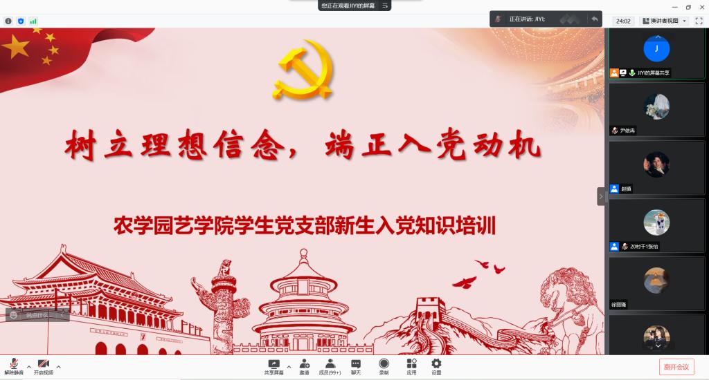 为加强新生思想教育,提高新生对党的认识、端正入党动机,2021年10月20日,农学园艺学院学生党支部通过腾讯会议开展了“树立理想信念,端正入党动机”新生入党启蒙教育培训。学生党支部书记嵇怡进行了讲解。