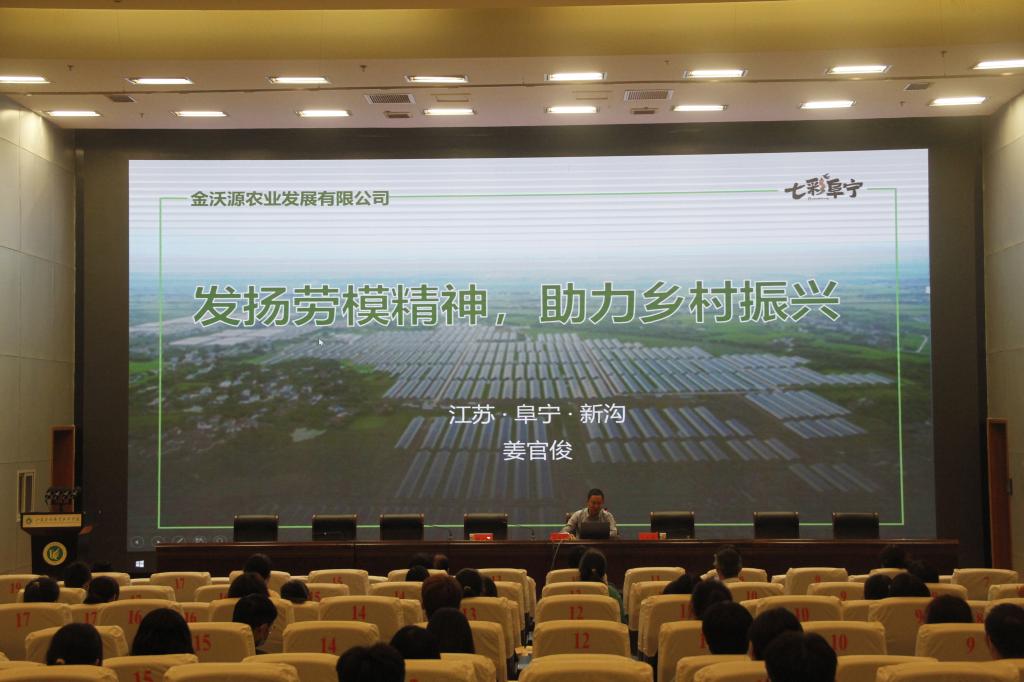9月25日下午,农学园艺学院在图书馆报告厅开展“劳模工匠进校园”活动。活动特邀我校杰出校友、江苏省劳动模范、盐城市金沃源农业发展有限公司总经理姜官俊同志作事迹报告。学院党总支副书记王全智主持会议,200余名师生参加。